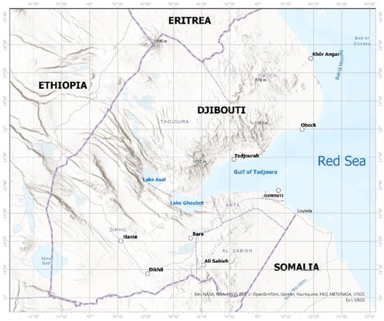 The Republic of Djibouti is a country located in East Africa at coordinates 43°00′ E, 11°30′ N (see Figure 1). The country spans 23,200 square kilometers and experiences a climate characterized by two distinct seasons: winter and summer. Winter is characterized by hot and humid conditions, while summer is characterized by extremely hot and humid conditions. In winter, the temperature fluctuates between 20 °C and 22 °C, while in summer, it ranges from 30 °C to 40 °C. Despite its small population size of 988,002 in 2020, the country is facing a shortage of energy supply, with only half of the population having access to electricity. Power is available only 60% of the time, resulting in significant instability in the distribution of electricity and a substantial number of remote areas experiencing power outages [19]. The distribution of electric energy in Djibouti is controlled by EDD, which stands for Electricity of Djibouti. EDD has a legal monopoly over the entire distribution and transportation of electric energy throughout the country. The EDD’s social price range for electricity is between $0.21 and $0.52/kWh. It is widely acknowledged that the cost of electricity in Djibouti is significantly higher compared to neighboring countries, as reported by the Directorate of Statistics and Demographic Studies in 2018. The country possesses significant potential for various forms of renewable energies that can support sustainable development as well as address the needs of remote and rural populations [20,21,22]. In this context, wind energy is a promising energy source in Djibouti. Although several studies have been conducted to estimate the potential of renewable resources in Djibouti, with a particular emphasis on solar and geothermal energy (e.g., [1,23]), there are only a limited number of studies that have been performed on wind energy.