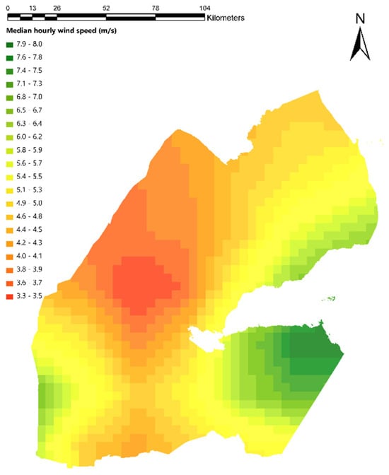 There is a significant variation in wind velocity across Djibouti, revealing that the southeastern and certain areas of the southwestern regions are particularly well-suited for the development of wind farms, as the wind velocity exceeds 6 m/s, as depicted in Figure 2. Conversely, western and northwestern regions with wind velocity below 3 m/s are not suitable for the installation of wind farms. The diverse climate of Djibouti, which is affected by its coastal position and distinct topographical characteristics, is the reason for the variation in wind velocity across different areas. In addition, the existence of flat or gently inclined land, specifically in the southeastern and certain areas of the southwest regions of Djibouti, provides a long and wide stretch of land that enables the unrestrained movement of wind, which leads to increased wind velocity. Table 3 indicates that over 38% of the study area falls within the range of suitability from moderate to very high wind velocity. Conversely, the remaining 62% of the study area is categorized as being less suitable to not suitable for installing a wind farm, as shown in Figure 2.
