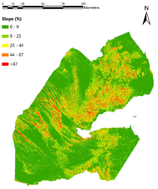 Wind turbines are usually situated on land that has slopes of less than 10–20% in order to maximize operational efficiency and minimize difficulties during installation [62]. Furthermore, higher ground slope is an indication of rough topography which would adversely influence transport and installation logistics. Locations with steeper slopes are of lesser significance than those with gentler slopes [33,63]. Areas with slopes less than 25% are considered suitable for this study, whereas areas with slopes exceeding 67% are excluded from the analysis.