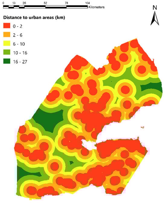 The proximity to urban areas influences operational efficiency, environmental considerations, and community acceptance. When selecting sites for wind farms, it is important to take into account the proximity to urban areas in order to minimize potential conflicts with local communities and ensure adherence to regulations and noise standards [61,64]. In addition, the safety of the residents and the disruptions to their daily activities that may result from wind turbine operations must be carefully considered [65]. Incorporating the distance to urban areas into site selection processes enables stakeholders to make informed decisions that maximize energy generation potential while minimizing conflicts and costs associated with urban proximity [62]. A wind farm project’s social acceptance by the local population can be improved by strategically placing wind farms at a suitable distance from urban centers. Hence, sites located further away from urban areas hold more significance compared to sites in closer proximity to urban areas. Areas located more than 10 km away from urban areas are deemed to be suitable [54].