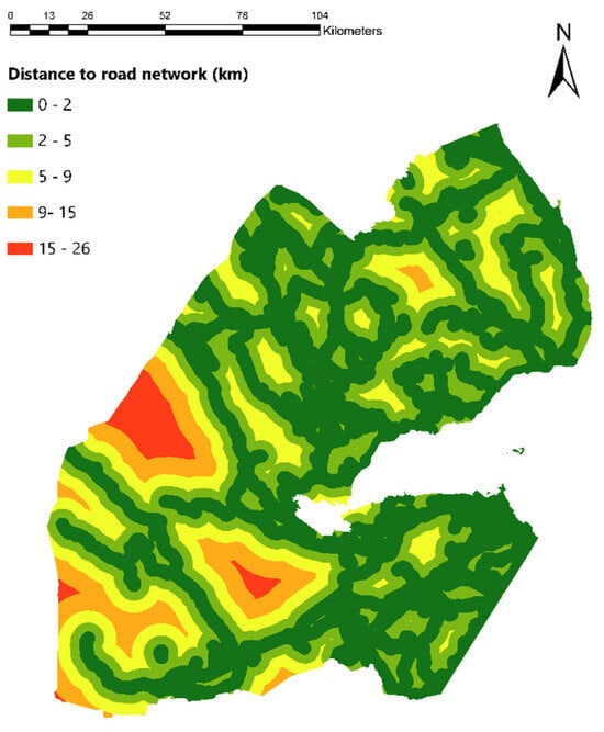 The proximity to road networks affects the costs associated with construction and maintenance as well as the effectiveness of operations. Wind farm developers attempt to minimize construction and maintenance costs, emphasizing the importance of taking into account the distance of potential sites to road networks [66]. Proximity to road infrastructure reduces transportation expenses, facilitates equipment delivery, simplifies maintenance operations, and enhances emergency response and evacuation capabilities ultimately improving the economic feasibility of wind farms [63,67]. Construction sites located in close proximity to road networks offer enhanced accessibility for construction equipment, personnel, and maintenance vehicles, resulting in improved project management and reduced operational downtime [68]. Furthermore, the closeness to road networks plays an important role in minimizing negative environmental effects and maximizing land utilization [39]. Developers who build wind farms near existing road infrastructure can minimize the fragmentation of all animal species’ habitats, the disturbance to wildlife, and the need for new road construction [18]. Consequently, sites in close proximity to road networks hold more importance compared to sites located farther away from road networks. Locations within a 5-km radius of road networks are regarded as suitable [33].