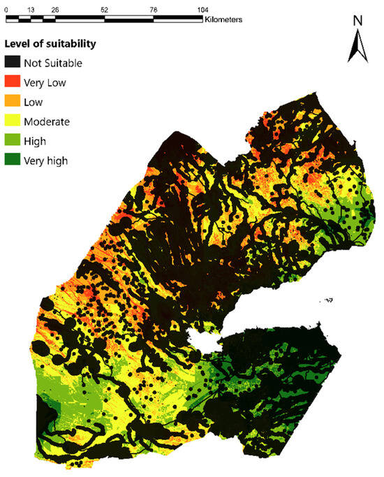 The final suitability map of Djibouti was generated by combining the objectively obtained weights of the criteria, which were calculated using the CRITIC method, with the grading process of potential sites. The final suitability map was generated by assigning corresponding weights to the criteria within the ArcGIS program, wherein potential sites in Djibouti were graded based on each criterion. The final suitability map of Djibouti is presented in Figure 9.