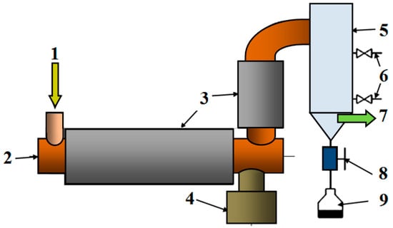 Schematic of a complete biomass pyrolysis station: 1—feedstock introduction pipe, 2—reactor with screw conveyor, 3—electric heaters, 4—biochar container, 5—gas cooler, 6—cooling water pipes (outlet and inlet), 7—gas outlet, 8—pyrolysis fluid drain valve, 9—fluid container.