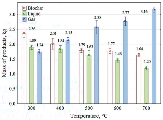 The amount of pyrolysis products depended on the reactor temperature used in the experiment. The measured gas temperature at the cooler outlet pipe ranged from 19.6 to 25.5 °C. It was, therefore, low enough to consider that the liquids formed in the reactor (pyrolisis oil and water), venting it as a gas, were condensed in the cooler. The masses of the products obtained from the pyrolysis of 6.0 kg of wheat straw pellets, depending on the reactor’s temperature, are shown in Figure 2. The gas mass was determined using the mathematical Formula (1). A higher process temperature increases the mass of gas produced and, at the same time, decreases the mass of pyrolytic liquid obtained. On the other hand, the summed mass of gas and liquid increased with increasing pyrolyser temperature at the expense of the solid residue—biochar mass. Its composition also changed.