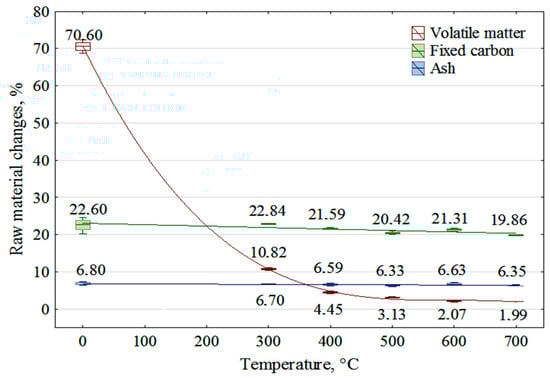 The graph in Figure 3 shows how, with increasing temperature, the part of the biomass most susceptible to transformation to gas and pyrolytic fluid increased. This part of biomass was designated by TGA analysis as volatile matter. The share of fixed carbon in the transformation was negligible, comprising only about 1.74% by weight of the biomass used. The increase in ash content of the biochars produced at higher temperatures, shown in Table 2, was mainly due to their loss of volatile matter. In fact, changes in ash weight relative to its weight in the feedstock hardly existed.