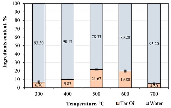 The higher temperature of the reactor affected not only the reduction in the weight of the pyrolytic fluid obtained but also its tar oil content. Changes in the composition of the pyrolytic fluid are shown in Figure 4. The highest tar oil content in the fluid occurred at temperatures of 500 and 600 °C. Then, at a reactor temperature of 700 °C, the tar content decreased, but the water content increased. This change was due to a slight loss of volatile matter and fixed carbon content at this temperature in the biochar and an increased mass of gas obtained at 700 °C. Without an oxygen supply from outside the reactor, the water formed during pyrolysis was solely the result of the moisture content of the raw material used and the oxygen- and hydrogen-containing organic compounds contained in it.