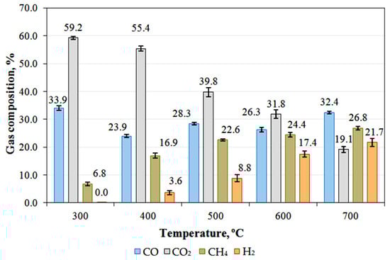 Changes in the content of the individual gases CO, CO2, CH4, and H2 as a function of reactor temperature are shown in Figure 5. The carbon monoxide content was highest at 300 °C and 700 °C. The carbon dioxide content decreased successively with increasing process temperature, from 59.2% at 300 °C to 19.1% at 700 °C. Instead, at the same temperatures, the content of high-energy methane increased from 6.8% to 26.8%, as did that of hydrogen, which appeared in the synthesis gas at 400 °C in a content of 3.6% and increased to 21.7% at the highest temperature value.