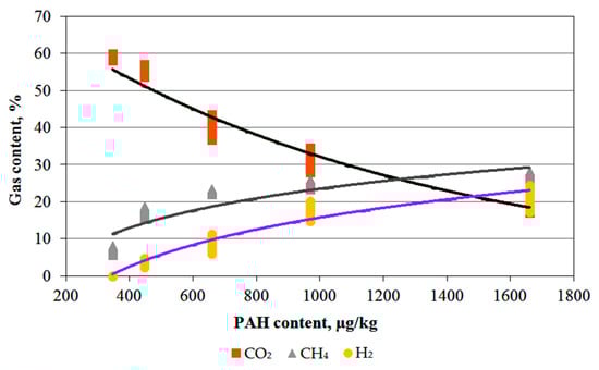 Analysing the total mass of syngas separated, one can see a correlation between syngas mass and the total masses of aromatic hydrocarbons in the biochar and the oil. Although the increases in PAH content in biocarbon and tar oil and syngas mass are mainly due to the pyrolysis temperature, it was decided to try to relate the volumetric contents of certain gases found in the syngas composition to the PAH content of the biochar. Relationships were observed between increasing PAH content, decreasing CO2 content, and increasing CH4 and H2 content. These relationships are shown in the dot plot in Figure 6. The plot was prepared by analysing the dependence of the pyrolysis gas’s content on the biochar’s PAH content, considering the values of gases and PAHs values for the same reactor temperatures.