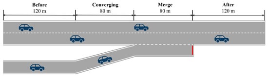 The traffic scenario is a merging area on a highway, which consists of four parts: the front section of the merging area, the acceleration area, the merging area, and the rear section of the merging area. The main lane contains two lanes and allows lane changes. The function of the acceleration lane is to provide vehicles with a speed close to that of the vehicles in the main lane when entering the highway from the ramp. The merging lane is the area where the acceleration lane and the main lane gradually merge, and vehicles complete the merge and enter the main lane in this area. The lengths of the four areas are 120 m, 80 m, 80 m, and 120 m, respectively, with a lane width of 3.75 m and a size of 5 m × 2 m for each vehicle, as shown in Figure 2. The environment is built based on the gymnasium 0.26.3 environment [] developed by OpenAI and uses the Python language.