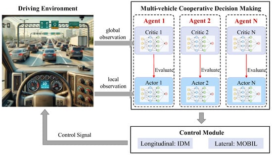 The architecture of our MARL framework: the control module is given to the existing IDM and MOBIL models, and the focus of the research is the multi-vehicle cooperative decision-making module based on MADDPG.