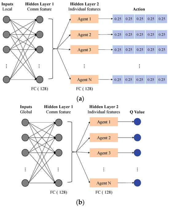 In MARL, agents learn how to take optimal actions in different states to maximize the cumulative returns by interacting with the environment. There are three main methods: policy-based, value-based, and actor–critic-based. The policy-based architectures directly optimize the policy itself, which is suitable for complex continuous control tasks and performs better in exploration. However, the strategy gradient approach is weak in training stability because it is prone to large variance, and it is difficult to capture the complex interactions between agents. The value-based architecture has high sampling efficiency and can achieve stable training in discrete action spaces, but its exploration efficiency is low in high-dimensional scenarios []. Therefore, actor–critic architecture, which combines the advantages of policy gradient and value function approximation, came into being []. It uses an “Actor” network to select actions and another “Critic” network to evaluate the value of these actions to improve learning efficiency and performance []. This framework performs well in many complex tasks, especially when dealing with continuous action space problems in high-dimensional complex environments, such as A3C (Asynchronous Advantage Actor–Critic) and DDPG [].