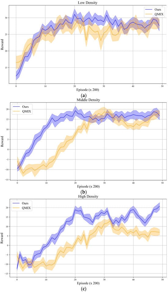 Figure 5 is a comparison of the results of our method and the QMIX algorithm under three levels of traffic density. It can be seen that in the case of low density, both algorithms converge to a relatively stable reward level in a relatively short time, but it can still be seen that the results of QMIX have a large volatility. In the case of medium density, the convergence speed of our algorithm is significantly faster than that of QMIX, especially in the first 20 episodes; the reward value of ours increases rapidly, while QMIX lags behind. The final reward value of ours is significantly higher than that of QMIX; the fluctuation in the algorithm results is smaller, and the performance is more stable. In the high-density traffic flow scenario, similar situations are also shown in the above two scenarios. In summary, the algorithm we proposed has demonstrated strong adaptability and strategy learning capabilities under different traffic flows.