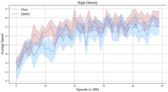 It can be seen that when there are more vehicles on the road, compared to the QMIX method, our proposed method improves the average speed of vehicles from 22.5 m/s to 23.5 m/s. In addition, the convergence of our algorithm is significantly faster than that of QMIX, and the range of fluctuation is smaller, which is more effective to improve the efficiency of traffic.