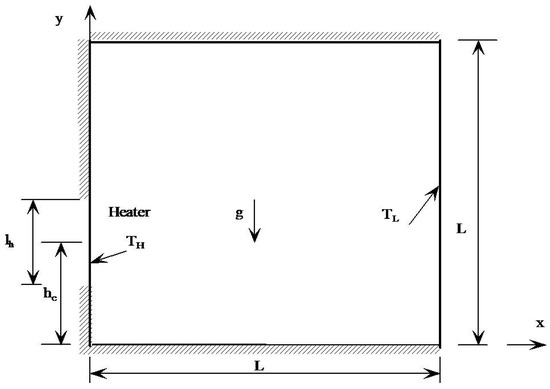 The following describes the paper’s three sections. Section 2 is divided into four parts—the first part describes the physical model, the second part presents the mathematical model, the third part introduces the numerical solution, and the last part presents the validation of the current model. Section 3 illustrates the results and discussions and is divided into five parts: the first part demonstrates the effect of Rayleigh number; the second shows the effect of heater location; the third illustrates the effect of heater size; the fourth shows the effect of nanoparticle loading, and the last part demonstrates the derived correlations for the average Nusselt number. Section 4 presents the conclusions drawn from the discussed results.