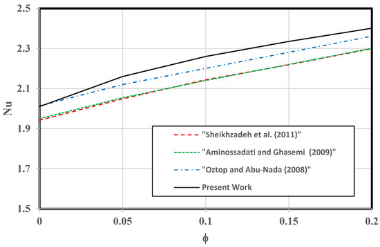 The second test is carried out by comparing the current model results with those obtained for the same problem in earlier works by Oztop and Abu-Nada [35], Aminossadati and Ghasemi [36], and Sheikhzadeh et al. [38], as shown in Figure 2. A good agreement between the current prediction and the previous work is noticed. The graph shows how the mean Nusselt number is affected by the variations in the quantity of Cu concentration (nanoparticles) at Ra = 104. From Figure 2, the maximum deviation between the present predictions and that of Refs. [36,38] are 5.4% and 5.6%, respectively, and that between the current predictions and [35] is 2.7%, which is acceptable in engineering applications. It is noted that Refs. [35,36,38] used the finite volume method, whereas the present work used the finite element method.
