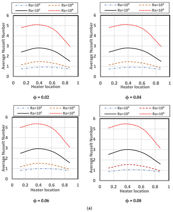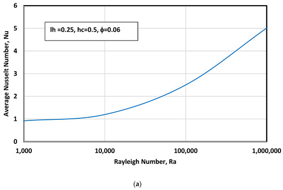 The impact of the Rayleigh number on the heat transfer rate and flow characteristics may be the most effective parameters that govern the natural convection phenomenon. Figure 3a illustrates the change behavior of the mean Nusselt number along the heater surface for heater length, lh = 0.25, and the center of heater location, hc = 0.5, and nanoparticle loading of ϕ = 0.06 for various values of the Rayleigh number. The figure elucidates that a higher Rayleigh number results in an increase in the mean Nusselt number.