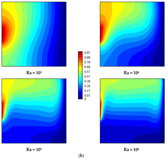 The temperature contours shown in Figure 3b further highlight this, demonstrating that at lower values of a Rayleigh number, i.e., Ra = 103, the thermal boundary layer is thicker, resulting in a lower temperature gradient and a lower rate of heat transmission. So, as the Rayleigh number goes up, the thermal boundary layer becomes thinner. This makes the temperature gradients larger, which in turn makes the rate of heat transfer higher. Also, the more stratification of thermal layers observed with the increase in Rayleigh number, the higher the temperature gradient at the side walls.