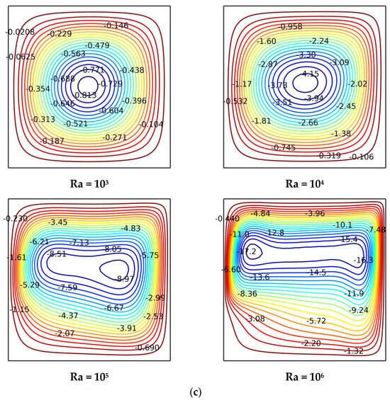 Furthermore, the above-described phenomenon is also confirmed by the flow field depicted by the stream function contours in Figure 3c. The figure shows how the maximum absolute value of the stream function becomes stronger by increasing the Rayleigh number. Also, the increase in Rayleigh number results in incrementing the streamline’s intensity, especially at the heated and cooled vertical walls. Additionally, the increase in Rayleigh number results in a higher intensity of convection flow, which causes the primary vortex of the fluid flow, which revolves in a clockwise direction, formed in the middle of the enclosure at a lower value of Rayleigh number to break into two vortices above the middle. Furthermore, the form of the primary vortex was altered from circular to rectangular.