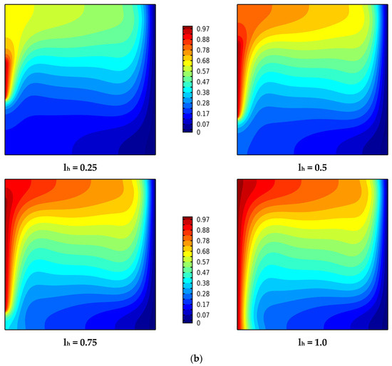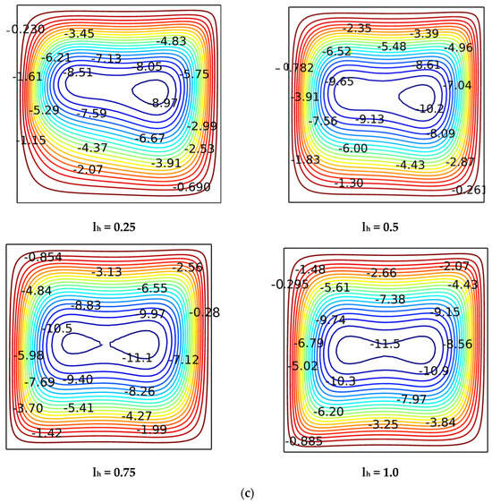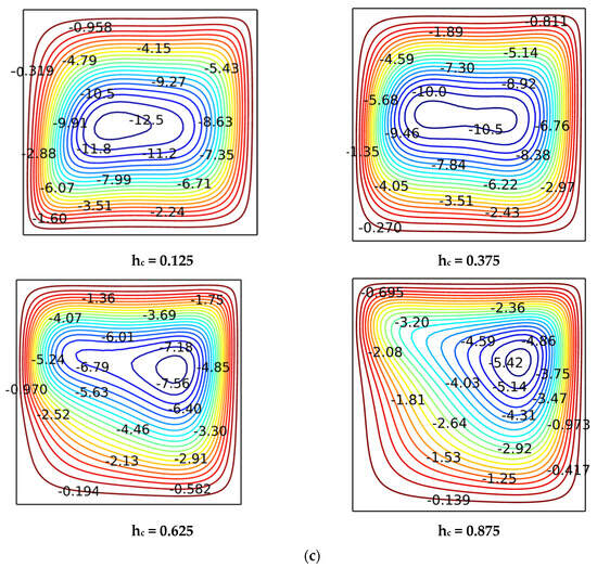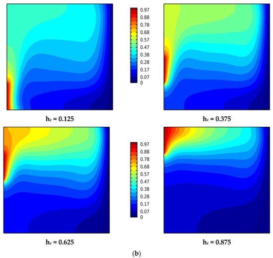 Also, the figure shows that an increasing Rayleigh number improves the average Nusselt number. The impact of the heater position on the thermal field denoted by temperature contours is illustrated in Figure 4b for Rayleigh number Ra = 105, heater dimension lh = 0.25, and nanoparticles’ volume fraction ϕ = 0.06. It is illustrated from the graph that the isotherms are nearly parallel to the heater surface, implying dominant conduction, causing a lower heat transfer rate for heater location hc = 0.125. Also, as the center of the heater location increases up to the midplane of the enclosure, most part of the heater has a thinner boundary layer, indicating a higher heat transfer rate, and then above the midplane of the enclosure, the thermal boundary layer for the heater becomes thicker and causing lower heat transmission rate in a drastic manner. The flow field denoted by the stream function contours demonstrated in Figure 4c confirms the phenomenon. The figure illustrates that increasing the heater location enhanced the maximum absolute value of the stream function till the midplane of the enclosure, and then it decreased after the midplane in a drastic manner. Also, the heater position greatly influences the shape of the flow vortex, which has a smaller size when the heater is located either at the top or the bottom of the side wall and is stretched when the heater becomes near the midplane of the cavity.