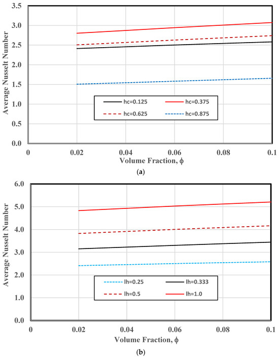 Figure 6a demonstrates the influence of nanoparticle loading represented by the volume percentage on the mean Nusselt number for various heater locations at Ra = 105 heater length of lh = 0.25. The figure depicts the maximum increase in the average Nusselt number of 10%, corresponding to a volume fraction increase from 2% to 10% for a heater location of 0.875. Also, the impact volume concentration of nanoparticles on the Nusselt number for various heater sizes for heater location hc = 0.5 and Ra = 105 is illustrated in Figure 6b. It depicts the greatest increase in the mean Nusselt number, which is about 9.4%, corresponding to a volume fraction increase from 2% to 10% in the case of a heater length of 0.333.