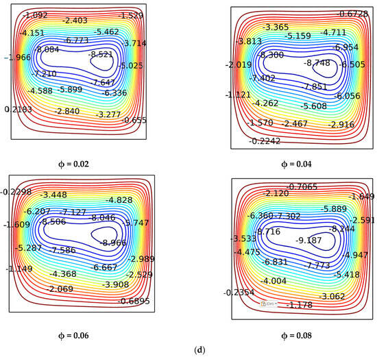 The impact of Cu solid nanoparticle concentrations that were dispersed in pure water on the thermal field, represented by the temperature contours for heater length lh = 0.25, heater location hc = 0.5, and Ra = 105 is demonstrated in Figure 6c. Also, the impact of the volume percentage of nanoparticles on the flow field represented by stream function contours for heater length lh = 0.25, heater location hc = 0.5, and Ra = 105 is illustrated in Figure 6d.