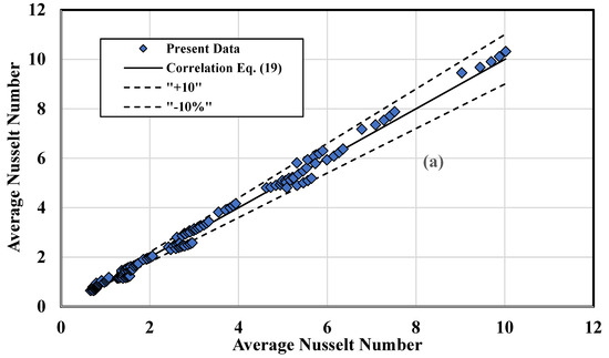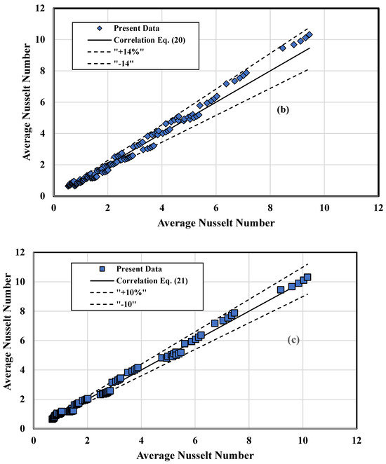 Figure 7c displays the correlation Equation (21) above, demonstrating that the highest difference between the data and the correlation equation is within ±10%.