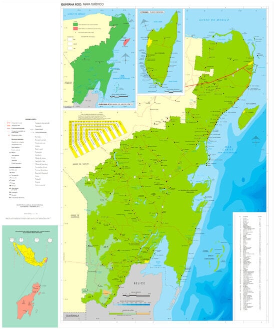 - Google. Cartografía Zonas Turísticas de Quintana Roo. 2024. Available online: https://www.gifex.com/images/0X0/2009-09-17-5163/Mapa_de_Quintana_Roo.jpg (accessed on 5 August 2024).