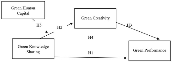 Furthermore, the digital platforms used by organizations at organizational and individual levels facilitate green knowledge sharing. Digital platforms allow the rapid dissemination of green knowledge across geographical and organizational boundaries, enhancing the scope for creativity [26]. In light of the above arguments, it is assumed that organizations can significantly enhance their ability to generate creative, sustainable solutions by enabling access to diverse knowledge and fostering an environment conducive to collaboration. Therefore, the hypothesis developed is as follows: