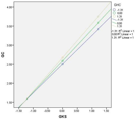 In the next step, we looked into the moderating role of green human capital. To test the hypothesis related to the moderating role of green human capital, we used Model 1 of Hayes’ PROCESS macro. To confirm the moderation, the significance of both the interaction and conditional effects are required [49]. The interaction effect of green knowledge sharing and green human capital [GKS × GHC] is significant and positive [b = 0.050; p < 0.05; LLCI = −0.001; ULCI = −0.099]. Additionally, the results of the overall moderation regression model are also significant [R2 = 0.720; ΔR2 = 0.01; F = 255.12; p < 0.001]. See Table 5.