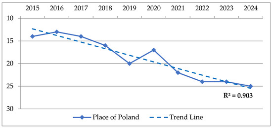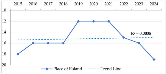 Figure 5 shows Polish economic science consistently occupied the 12th position in the world ranking in 2019–2021. Then, from 2021 to 2024, the place of Polish economic science fell from 12th to 19th position. The trend line for the last period has high correlation coefficient values (R2 = 0.9680). According to [34], R2 values of 0.9680 indicate high explanatory power of dependence, where the predictors explain most of the variation in the dependent variable. Such a high value indicates that the model effectively predicts the outcome [34].