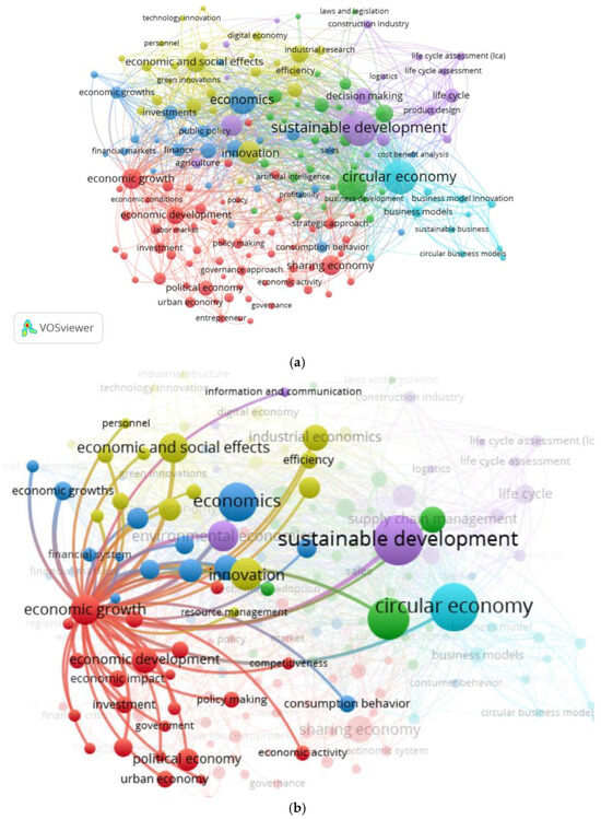 Query “economy”: Keyword map (a), cluster “economic growth (b), cluster “innovation” (c). (https://www.scopus.com/ accessed on 28 September 2024, analysis tool—VOSviewer, version 1.6.19, ©2009–2023 Nees Jan van Eck and Ludo Waltman).