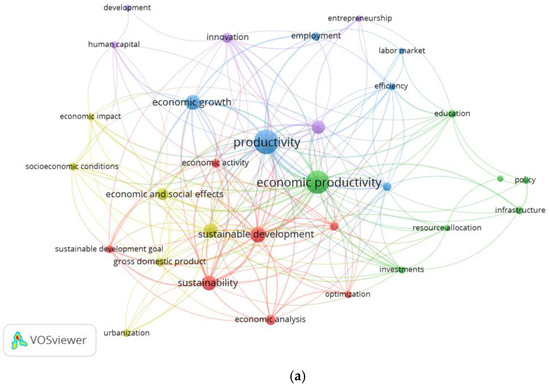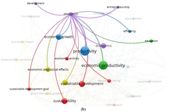 Query “economic productivity”: Keyword map (a), cluster “innovation” (b). (https://www.scopus.com/ accessed on 28 September 2024, analysis tool—VOSviewer, version 1.6.19, ©2009–2023 Nees Jan van Eck and Ludo Waltman).
