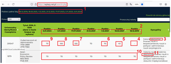 Figure 6 shows that the journal Gubernaculum et Administratio received a weight of 40 points when the journal weights changed on 18 February 2021 (rectangle 5). Then, this journal received 70 points on 1 December 2021 (rectangle 6). And, for the third time in 2021, this journal retained 70 points (the number “70” to the left of rectangle 6) on 21 December 2021. In 2021, the journal was not indexed in the Scopus and Web of Science databases. Still, it became as attractive to Polish scientists as the Asian Economic Policy Review, indexed in the Scopus and Web of Science databases, and has an impact factor (rectangle 10).