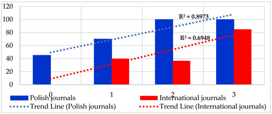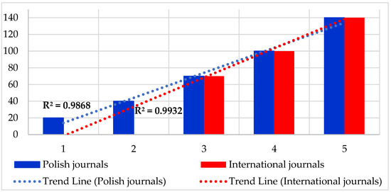 Figure 8 shows two ascending trend lines with a slight difference in slope. The correlation coefficient for Polish journals is R2 = 0.9868. The correlation coefficient for foreign journals is R2 = 0.9932. These values of the correlation coefficients are much higher than those of the correlation coefficients for the two samples, both for Polish and foreign journals, in Figure 7. R2 values close to 1.000 indicate the high explanatory power of the model, where most of the variation in the dependent variable is explained by the predictors [34]. Such a high R2 value indicates that the authors’ model effectively predicts the outcome within the selected data.