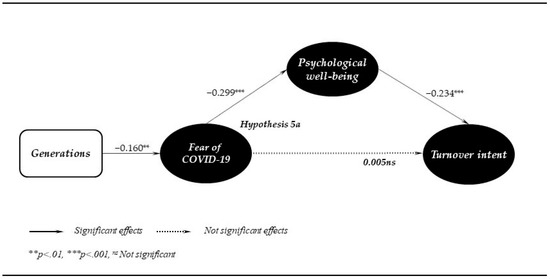 The final structural model showed an appropriate level of goodness of fit (χ2 = 430.539, df = 132, χ2/df = 3.262, GFI = 0.860, NFI = 0.881, CFI = 0.914, RMR = 0.048, and RMSEA = 0.087). The fear of COVID-19 diminished with generations (β = −0.160, t = −2.678, p < 0.01); hence, Hypothesis 1 was accepted. Hypothesis 2 posits that fear of COVID-19 negatively affects employees’ psychological well-being. In this study, anxiety stemming from the coronavirus reduced employees’ psychological well-being (β = −0.299, t = −4.573, p < 0.001); thus, Hypothesis 2 was also accepted. Hypothesis 3 posits that fear of COVID-19 positively affects employees’ turnover intent. However, no significant impact on turnover intent was observed in this study (β = 0.005, t = 0.078, p > 0.05). Therefore, Hypothesis 3 was rejected. Hypothesis 4 states that employees’ psychological well-being negatively affects turnover intent. In this study, psychological well-being minimized such intent (β = −0.234, t = −3.356, p < 0.001), thus lending support to Hypothesis 4.