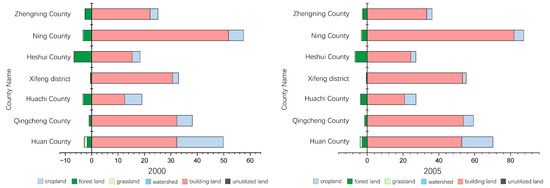 (1) Between 2000 and 2005, forest land, building land, and unutilized land exhibited growth. Notably, building land experienced the highest increase at 2.86%. The implementation of the farmland reforestation project in 2000 [30] led to a decrease in arable land and a noteworthy increase of forest land, with a motivation rate of 2.46%.