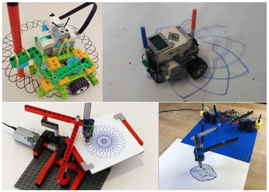 LEGO Education robot kits can be used at all levels of education to teach programming, robotics, and computational thinking and to show the connections within interdisciplinary content [,,]. A re-programmable robot kit, such as LEGO, is a great way to build a structure capable of automatic drawing. Figure 1 shows several drawing mechanisms built from different LEGO kits. In Isogawa’s book [], other drawing robots operating on various principles are found with detailed building instructions.