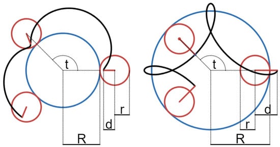 Depending on the relationship between d and r, three main types of central trochoids can be distinguished. If , that is, the tracing point is on the circumference of the rolling circle, we obtain an epicycloid or a hypocycloid. If , we have a curtate epitrochoid or a curtate hypotrochoid. In the case of , the name of the obtained curve is a prolate epitrochoid or a prolate hypotrochoid. In addition to this grouping, further important curves can be obtained by a particular choice of parametric constants. For example, if , it can be easily seen from Equations (1) and (2) that the obtained curves are circles with radius and ( is assumed). Further examples can be found in Table 1.