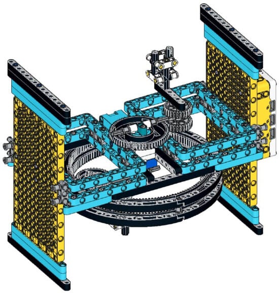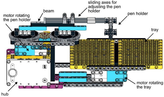 Similar to the SCARA-type robot, the operating principle of the new model is based on a combination of two circular movements. However, a significant innovation is that, this time, the robot remains fixed, and instead of rotating the whole robot, a tray is rotated, on which we attach a sheet of paper. An arm extends above the tray, at the end of which there is a holder suitable for receiving a writing instrument. The felt-tip pen can be easily and simply slipped in here; it has to be lowered enough so that the tip touches the paper sheet. In this case, no cutting is necessary; the entire felt-tip pen can be placed in the holder; other elements of the construction do not prevent it from moving freely. We had to make the pen holder move in a circular motion over the tray. We solved this by mounting the holder on a beam, which is attached to two gears that rotate at the same time so that the section connecting the attachment points is parallel and of equal length to the section connecting the centres of the gears. Figure 6 shows the final model picture of the new robot with the main components. Building instructions for the robot can be found in Supplementary Materials.