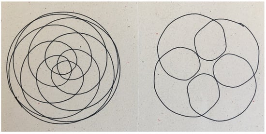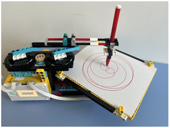 The hands-on involvement offered by robotics leads to the development and improvement of skills needed in the 21st century, such as problem-solving, critical and computational thinking, and cooperation [,,]. In particular, designing, building, and programming drawing robots provides an interactive way for students to learn math, engineering, and art concepts. The complex activity with robots allows students to explore their creativity while deepening their understanding of the mathematical theory of plane curves. Calculating and performing the manual settings and code adjustments necessary to achieve the desired drawing develops technical and engineering skills and highlights the direct link between theory and practice. Overall, drawing robots built from the LEGO Education SPIKE Prime kit are highly versatile and offer numerous opportunities for learning and creative expression.
