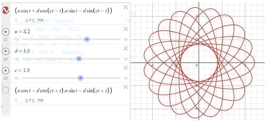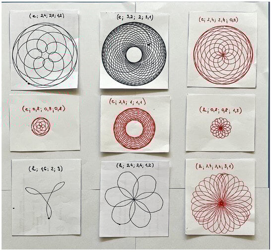 In addition to entertaining children, Spirograph-like toys can also be used for educational purposes. In the 1911 Schilling catalogue, there were two gear-based kinematic models that could be used to study the generation mechanism of different types of central trochoids []. Although these tools can currently only be studied in museums, today’s teachers have the opportunity to choose from a number of digital solutions for simulating the operation of mechanical drawing machines. Students experienced in programming can easily write graphical animations themselves, but anyone can download and use ready-made spirograph applications created with GeoGebra, Desmos, or other dynamic geometry software. These spectacular moving animations are undoubtedly excellent demonstration tools for illustrating the curve generation process. Still, they obviously provide a less physical experience than picking up and using a mechanical device.