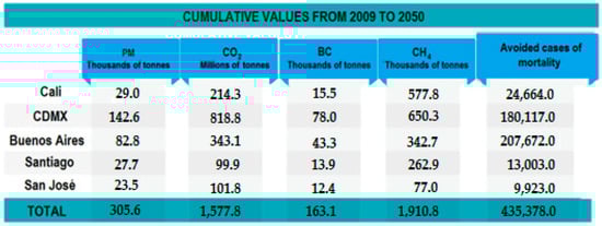 In the case of Latin America, for example, it has been suggested that, if no action is taken to change this situation, by 2050, the region’s car fleet could triple and exceed 200 million units. According to the International Energy Agency estimates based on the Methodology for the Assessment of the Integrated Benefits of Electric Mobility Policies, carried out by the Clean Air Institute (Clean Air Institute) [], in cities with a high density of urban transport in Latin America, the replacement of this by EVs could bring about an appreciable decrease in polluting elements such as particulate matter, carbon dioxide, black carbon and methane and a decrease in mortality from air quality-related diseases, as shown in Figure 2.