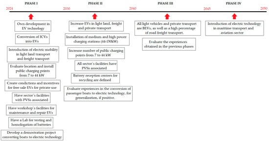 On the basis of the above, and taking as a starting point the year 2024 and as an end point for introduction in the year 2050, the strategy (roadmap) to introduce electromobility in the transport sector could be envisaged, as shown in Figure 3.