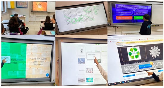 In Table 1, the steps for the application process carried out with the students in the experimental group can be seen. Experimental-group students were provided with an education through a “Learning Apps” program with interactive elements, which is one of the Web 2.0-based digital game applications. In the first step, trial application was performed on a sample model, and the program was introduced to the students. Prior to the application, pre-test measurement was performed using the knowledge test, environmentally responsible citizen behaviors, and digital literacy scale. In the next step, students’ prior knowledge about the environment was revealed, and a brief lesson was performed in this process. Prepared for the theme of the environment with learning apps, 6 different interactive digital game activities were applied with the students with sub-topics based on a puzzle, competition, and matching. Prior to the activities, a video was played via the application. Activities were prepared based on the sub-topics of the introduction of the concepts of environment, the relation between humans and the environment, fundamental environmental problems, environmental protection, environmentally friendly behaviors, and biodiversity. Each digital game activity was applied in turn. The activities were focused on students, and in the first stage, students were included in the process carried out by the teacher. During the course of the application, the teacher tried to create an atmosphere of discussion, asking questions of the students and involving them in the process. In the last step, scales were applied again to reveal the post-test measurements of the tests whose pre-test measurements had already been performed. Of the 18-h application process, 4 h were devoted to the application of the tests and 11 h to the application of the activities. In addition, reading texts related to the theme were read and interpreted within 3 lesson hours. Interviews were performed with the students in the experimental group. Photographs of the digital game activities and application process are shown in Figure 1.