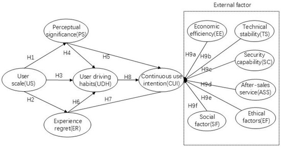 This study is based on the technology acceptance model (TAM) as its foundational framework. The TAM aims to explain and predict users’ acceptance of information technology, primarily highlighting two variables, perceived usefulness and perceived ease of use, which influence users’ decisions to accept and utilize information technology [36]. However, over time, researchers have discovered that these two variables alone do not fully account for all instances of technology acceptance. Consequently, they began to explore other factors that may affect technology acceptance, incorporating elements such as social influence, cognitive tool processes, and perceived user resources into the extended TAM model [42,43,44]. Therefore, building upon this theoretical foundation, this study integrates habit theory and regret theory, considering user scale, perceived importance, and post-experience regret as antecedent variables. These antecedent variables influence the intention for continued use through users’ driving and usage habits. Additionally, the model accounts for the potential impacts of external factors, including economic, security, technological, ethical, social influence, and service factors, on the construction of a model of sustained usage behavior for autonomous driving systems. This aims to better understand the factors and pathways that influence users’ intentions for continued use of autonomous driving systems.