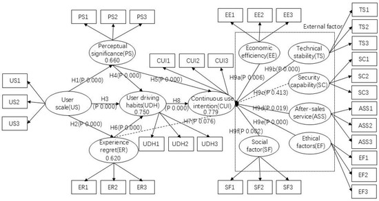 The scale measuring user size was adapted from Lee [64] and Karapanos [63] and employs items (US1–US3) for measurement. For the latent variables of perceived importance and the experience of regret, the scale was adapted from Davis (Davis, 1989), Yaffe [68], and Kim [69], utilizing items (PS1–PS3). The content regarding experience satisfaction and regret was adapted from Choi [73], Lankton [70], and Kang [72], measured by items (ER1–ER3). User driving habits were derived from Aarts [75] and measured using items (UDH1–UDH3). Adaptations of viewpoints on continuous usage intentions were taken from Agarwal [75] and Limayem [45], employing items (CUI1–CUI3) for measurement.