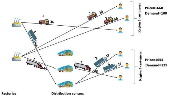 Table 4. Each cell in the table is structured to denote the pertinent details, where the initial numerical value signifies the count of transportation vehicles, while the subsequent numerical entry designates the specific type of vehicle. To illustrate, the notation “2-3” conveys that products originating from Manufacturer 1 have been transported to Distribution Center 3, utilizing three distinct transportation vehicles of type 2.