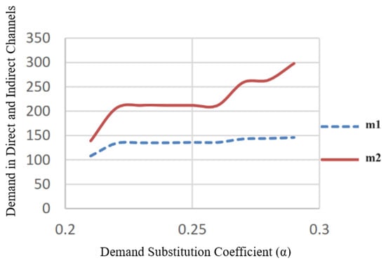 In assessing the pricing strategy for distribution channels, careful consideration is given to both the price sensitivity of customer demand (PS) and the degree of substitution among distribution channels (α), particularly within the larger direct distribution channel denoted as (α1, α2 = (0.3, 0.2) and as (PS1, PS2) = (0.5, 0.4).