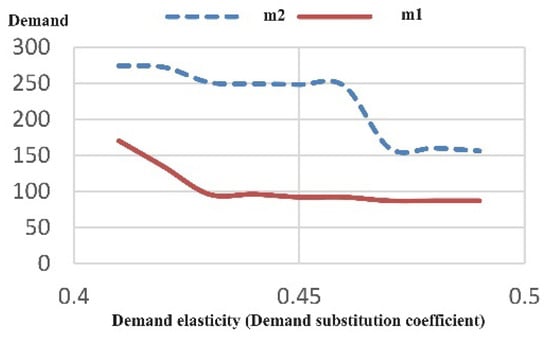 Table 5 reveal a discernible trend, where the escalation of transportation costs within the direct distribution channel precipitates a concomitant reduction in the demand observed within this particular channel, as juxtaposed against the baseline scenario. The discernible variance in demand between the first and second markets is primarily attributable to the elevated level of equipment wastage linked to transportation in the direct distribution channel. This elucidative scenario underscores that, in instances where transportation costs are equitably distributed for the dispatch of goods to both markets, there is a predilection toward the utilization of transportation means characterized by lower carbon dioxide emissions. Consequently, a discernible reduction in the quantity dispatched to the first market, in comparison to the initial scenario, is evident. The augmentation in demand disparity between the two channels is also reflected in the discernible optimal price differential.
