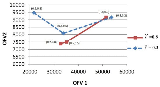 as (0.3, 0.7) to address the sample problem. In pursuit of unbalanced solutions with a heightened satisfaction degree level for the first objective function, the parameter γ is set to 0.4.